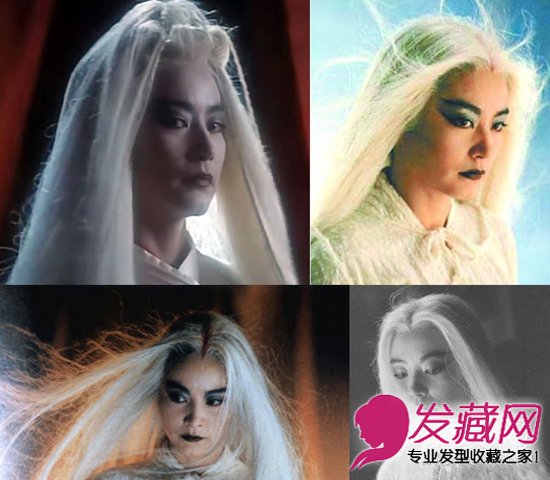 林青霞塑造的白发魔女绝对是经典中的经典,妖气凌厉的弯弯浓眉,加上上扬的吊眼鬼魅墨绿色眼妆,点睛之笔在于充满邪气的紫黑色的唇色,有凄狠决绝,也有媚眼如丝, 把练霓裳亦正亦邪的气质表现的最淋漓尽致。