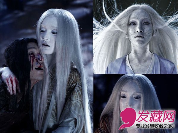 《画皮2》周迅的白发造型十分惊悚,毫无生机起色的长直白发,面如死灰,裂痕如腐尸,鬼魅的眼线加污浊的瞳孔完全是女鬼现身。