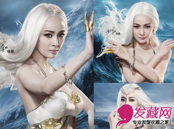 杨幂代言某游戏的宣传照,一头富有光泽感的飘逸白发搭配金色发饰,打造出动漫人物的超时空感,白亮的肌肤加淡淡的裸色唇妆,清秀淡雅,半烟熏眼妆提亮增添妩媚,但是杨幂的这一造型如果被“小糯米”看到了估计会吓哭吧。