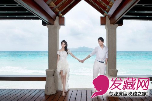 浪漫的海岛造型,外景婚纱照的场景,蓝天白云,海天一色,新娘的鱼骨辫编发搭配拖地长婚纱很是优雅性感,前面短礼服的设计更显性感美腿。陶喆身穿衬衫,尽显优雅熟男范。