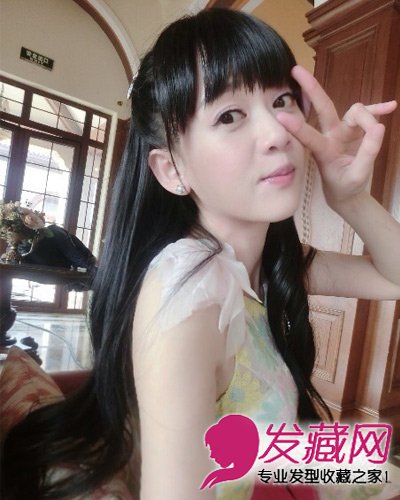 齐刘海搭配上半扎公主头让陈乔恩变身甜美可爱的千金小姐。