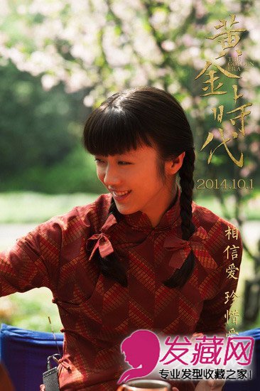 扎着麻花辫的少女,红色的旗袍,同色系的蝴蝶结做装饰,很是经典怀旧的一款造型,朴素的麻花辫让汤唯看起来极其平易近人。