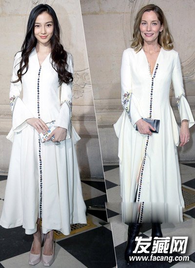 近日女神Angelababy盛装亮相伦敦时装周,白色复古风长裙让人眼前一亮,没想到这样业余外国名媛撞衫了!同样的白色的长裙,同样的偏分刘海造型,baby的长卷发让造型显得很是小清新,而外国名媛则传出一种飒爽英姿的感觉,你更喜欢一种呢?