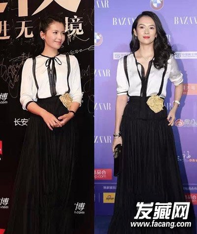 这款黑白色复古长裙,刘涛给人的感觉很清新,扎马尾辫更是减龄。选择了长卷发的章子怡则更有女人味,更加优雅。