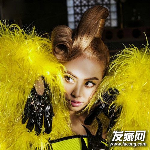 好像每一个奇葩发型都有蔡依林的身影,极具个性的道姑版马尾辫发型,高扎的马尾弄成个性的卷发造型,类似飞机头和花轮头的合体,再加上夸张的金属色配合夸张的眼妆,简直是潮和囧的结合体。