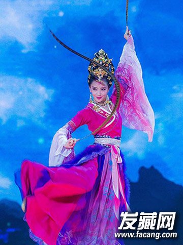 舞台上大秀舞技的佟丽娅,俏丽的容颜,高盘的精致发髻,高贵典雅,一身锦绣色彩艳丽裙装,展现出窈窕的身姿。