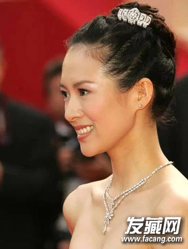 黑色头发的盘发很容易看不出细节,那么用闪亮的发饰来点缀是个不错的主意,更何况能和颈间的钻石项链来个呼应。