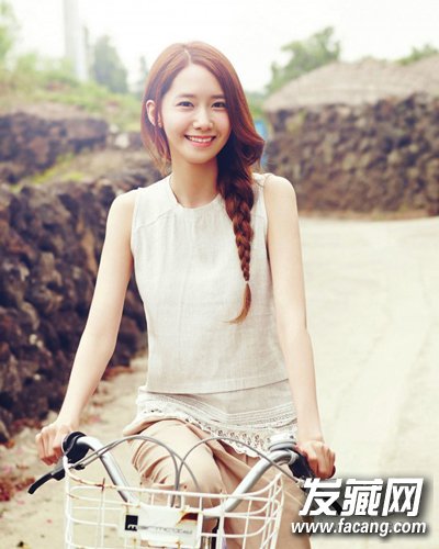 非常清新纯美的一款韩式侧编发造型,蓬松的侧分长发编成简单的马尾辫,搭配纯色上衣和裙子,更显森女气息。