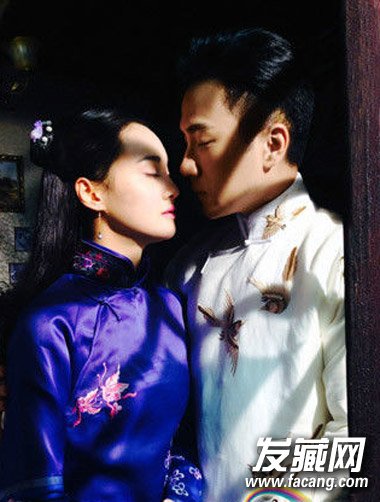 郑爽刘恺威剧照,长发披肩的郑爽双目紧闭,深沉的蓝色上衣很显老气。但同时暗色系的背景也让剧情增加了些许神秘感。