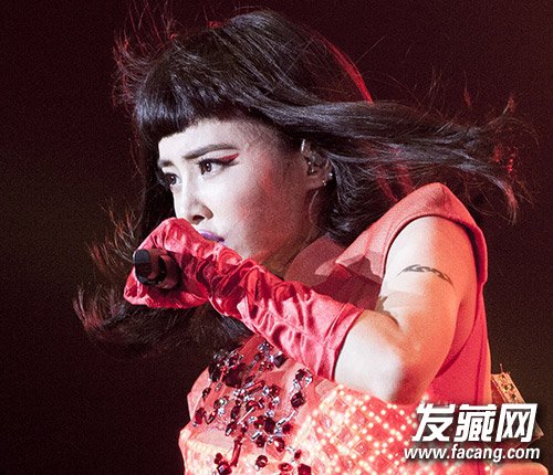 当音乐《I’m not yours》一响,蔡依林这款富有浓厚中国风风格的发型霎时亮瞎眼球。全身一片鲜红的造型搭配厚实齐刘海假发套,诡异的复古气息迎面而来。
