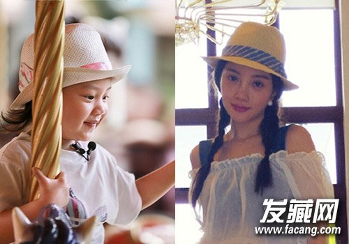小公主甜馨和李小璐一人一顶草编小礼帽,一个搭配宽松大T,休闲随意,另一个是麻花辫露肩雪纺衫,烂漫少女。