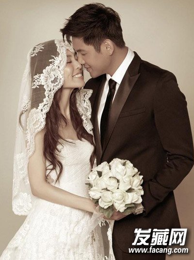 范玮琪婚纱照,钟爱长卷发的她就这样将长发披在肩头,印花修饰的蕾丝更添妩媚气息。