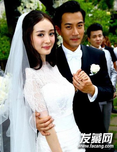 杨幂婚纱照造型,中分长卷发扎成半扎公主头,甜美清新,纯白色婚纱映衬下更显清纯妩媚。