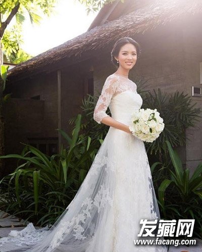 世界小姐张梓林婚纱照,经典编发盘发发型,也是现在新娘发型中很常见的一种,搭配透视蕾丝,高贵典雅。
