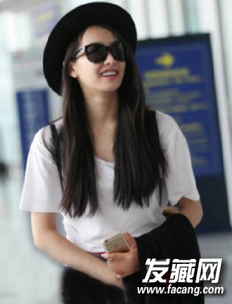 发型,自然的披散在胸前,清新柔顺又飘逸,无刘海的设计,搭配个性的墨镜,黑色的帽子,突显十足清新可人范。