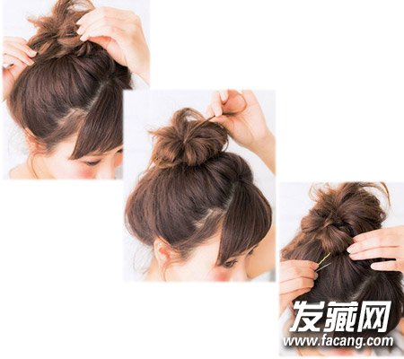 5,把剩下的发梢像要穿过在第四步中分开的团子头的正中那样卷起来。把发梢卷进橡筋里。