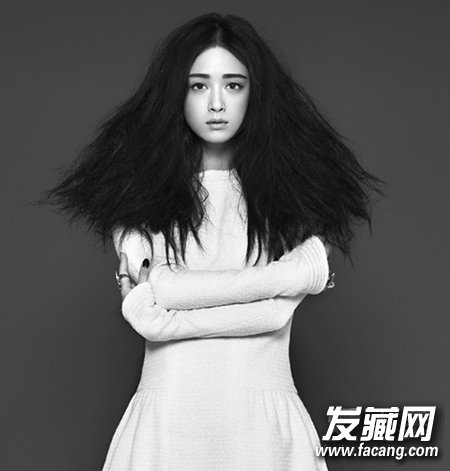 黑色长发烫出纹理感,披散在两侧,蓬松飘逸,中分发线,两侧几乎完美对称,黑白的颜色冲突经典又大气。