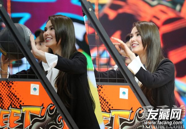 现场表演投篮,玩的很开心呢,侧面看这款发型,长刘海很好的修饰了脸型,让原本大脸的昆凌看起来也像瓜子脸了。