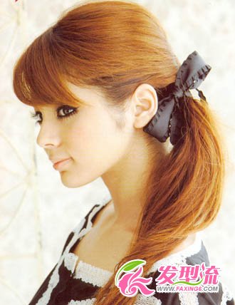 拥有美丽发流的看似一本正经的少女发型,将头发扎起,并在左侧拧转,轻轻按压发根,向上托起头发制造出蓬松感。搭配丝质头饰打造出清爽利落的公主气息,斜刘海起到修饰小脸的作用。