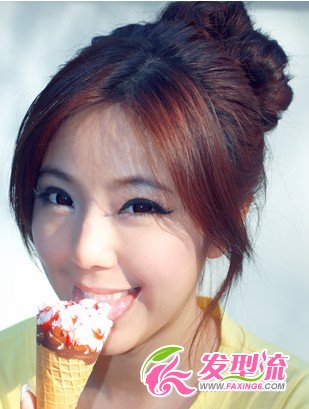 色调,将长发扎起盘出一个可爱的丸子头,可爱甜美不失青春的气质。中分的刘海长至而变,妩媚的眼睛很有魅力。