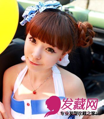 很是惹人喜爱的一款发型,将两侧马尾编织出发辫扎成丸子发髻,有种招财童子头的感觉哦!整齐的刘海让双眼显得更加明亮,可以利用圆点元素的碎布点缀在发型上,让造型呈现一种清新的田园风情哦!