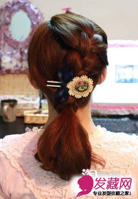 先分一部分头发编成麻花辫,在把头发扎成低马尾。很适合