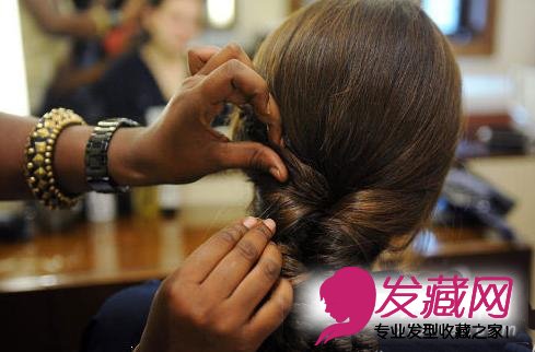 细麻花辫编到脑后接近鱼尾辫后,用发卡将发梢和脑后的麻花辫固定在一起。发尾塞入大的鱼尾辫中间。