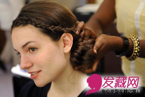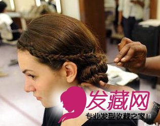 将大鱼尾辫拧转后在一侧耳后盘成发髻,用细发卡固定。