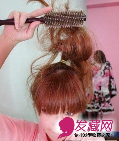 步骤四要绑出随性蓬松的花苞头,就需要将你的头发将用猪鬃毛圆梳刮得蓬松一些哦!发量少的女生可以制作出很蓬松的发尾。