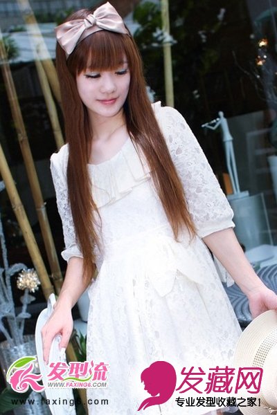 这款齐刘海长发发型给人可爱甜美的邻家女感觉,蝴蝶结发箍很好的把齐刘海与顶部发丝分开,栗色的齐刘海若隐若现的遮住双眉凸显了女孩的腼腆,柔美的长发宛如两道瀑布倾斜般垂落在胸前,让人引不住产生怜爱之心。