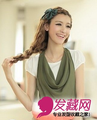 的基础上,取1/2长度的头发扎一个松松的麻花发辫,同样在刘海部位打造麻花辫,搭配依稀可见的女生烫发发型,带给我们新奇的感觉,刘海处的蝴蝶结发带,点缀了亮眼的麻花辫发型。