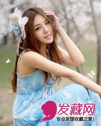 女生秀丽的长发,使用烫发发型设计,发尾微烫发的效果,加上棕栗色的染发色,使发丝带着点点毛躁蓬松感,中分发型,两侧长长的刘海发丝修饰了女生的脸型,戴上夸张的花朵发饰,森女气质显现出来。