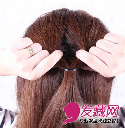 步骤2:之前扎的那半股发丝,用手指在皮筋的上部分位置,掏个小孔。