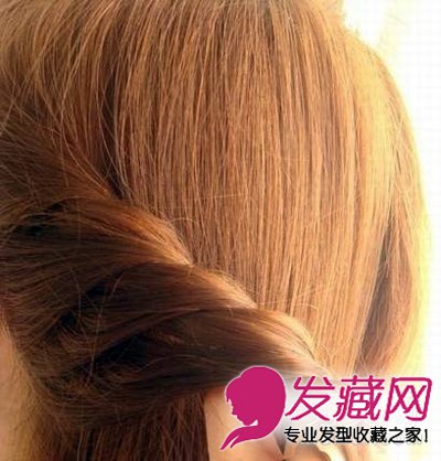步骤4:接着取出最左侧的两股发股,对扭两节,接着每扭一节,都将左侧手边的头发加一股进去进行对扭。