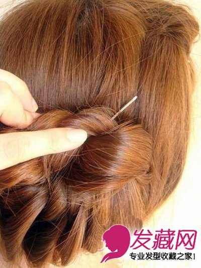 步骤7:接着将发尾由下至上翻转上去,用黑夹子固定好发尾处,最后调整一下整体造型。