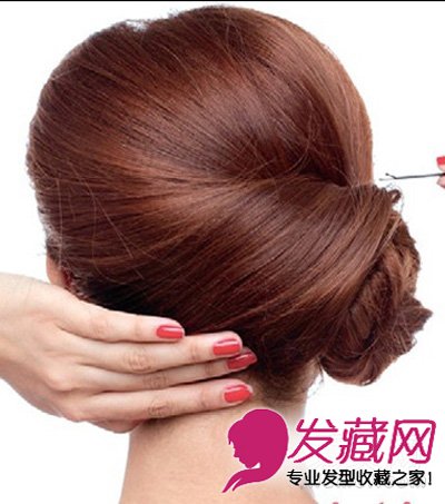 4、左侧发尾围沿右侧旋转的发髻边缘缠绕,并使用小竖夹固定,完成。