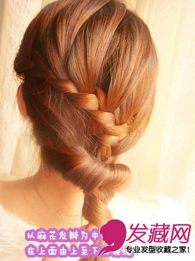 以麻花辫为中心点,旋扭发股在上面由上至下的缠绕。