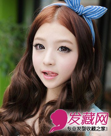 中分刘海露出额头,尽显夏日清凉感,咖啡色的长波浪营造出蓬松轻盈感粗来,绑上一个蝴蝶结发带,可爱感升级。