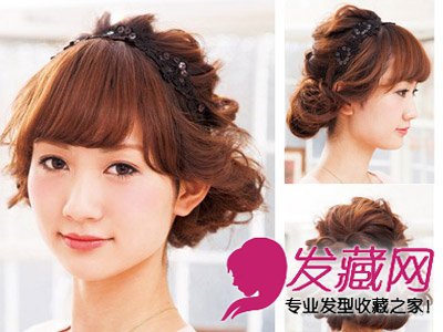 盘发效果饱满别致,宛若含苞待放的花苞。优雅的内扣斜刘海修饰脸型,最后戴上一条blingbling的发箍,甜美的气质立刻加倍。