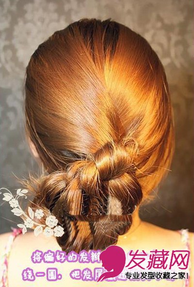 将编好的发辫沿着中心点,绕一圈,把发尾藏进发辫中去。