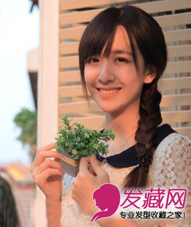 小清新范儿长发扎发,在侧边编麻花辫,搭配碎剪的薄透斜刘海发丝修颜甜美,适合春季里的一款约会发型。