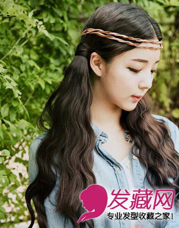 长长的卷发分成两股扎起,垂在肩膀两侧。中分的