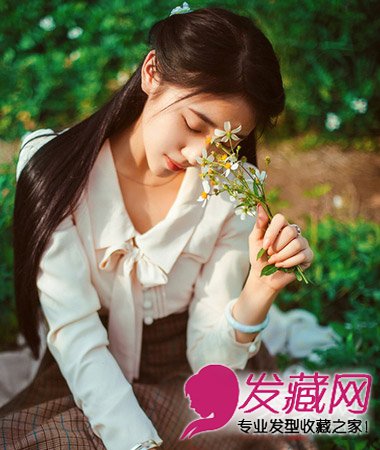 很有仙女范儿的一款中分长发扎发,中分发扎简单的半披肩发,露额发型清爽自然,很适合瓜子脸MM打理。