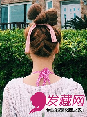 ,这款编发从后脑勺开始编起而后收拢发丝在发顶扎出一个甜美的蝴蝶结发髻,造型精致可爱。