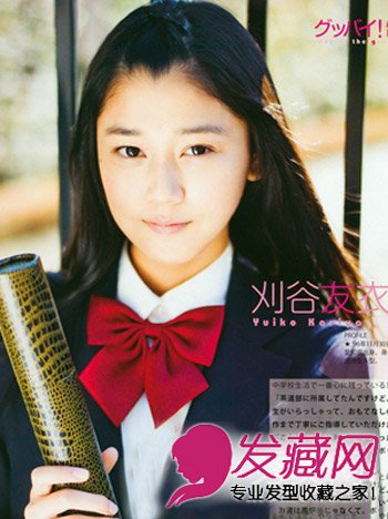 ,简单的黑长直发自然披肩,刘海扎起露出额头清新甜美,很有淑女气息。