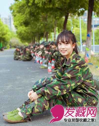 清爽的马尾辫扎发发型,细碎的空气刘海,一身迷彩服有种在度假的感觉。