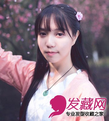 扎发,柔顺的及腰长发扎简单的半披肩发,搭配稀疏的刘海发丝修颜,甜美显清纯。