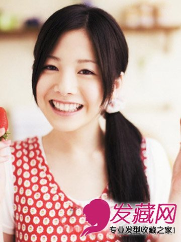 适合直发MM打理的一款简单披肩发扎法,顺直长发在侧边扎低马尾造型,三七分的长斜刘海修颜瘦脸,很小清新的甜美发型。
