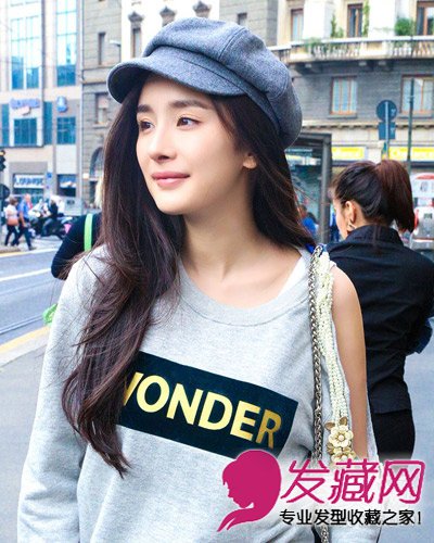 简约的长直发搭配上时尚帽子就可以很fashion,让杨幂看起来超级美。