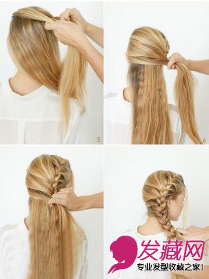 通俗地说,这就是蝎子辫的编法,一边编发一边往其中加入新发束;一直编到最底端,然后以皮筋固定。